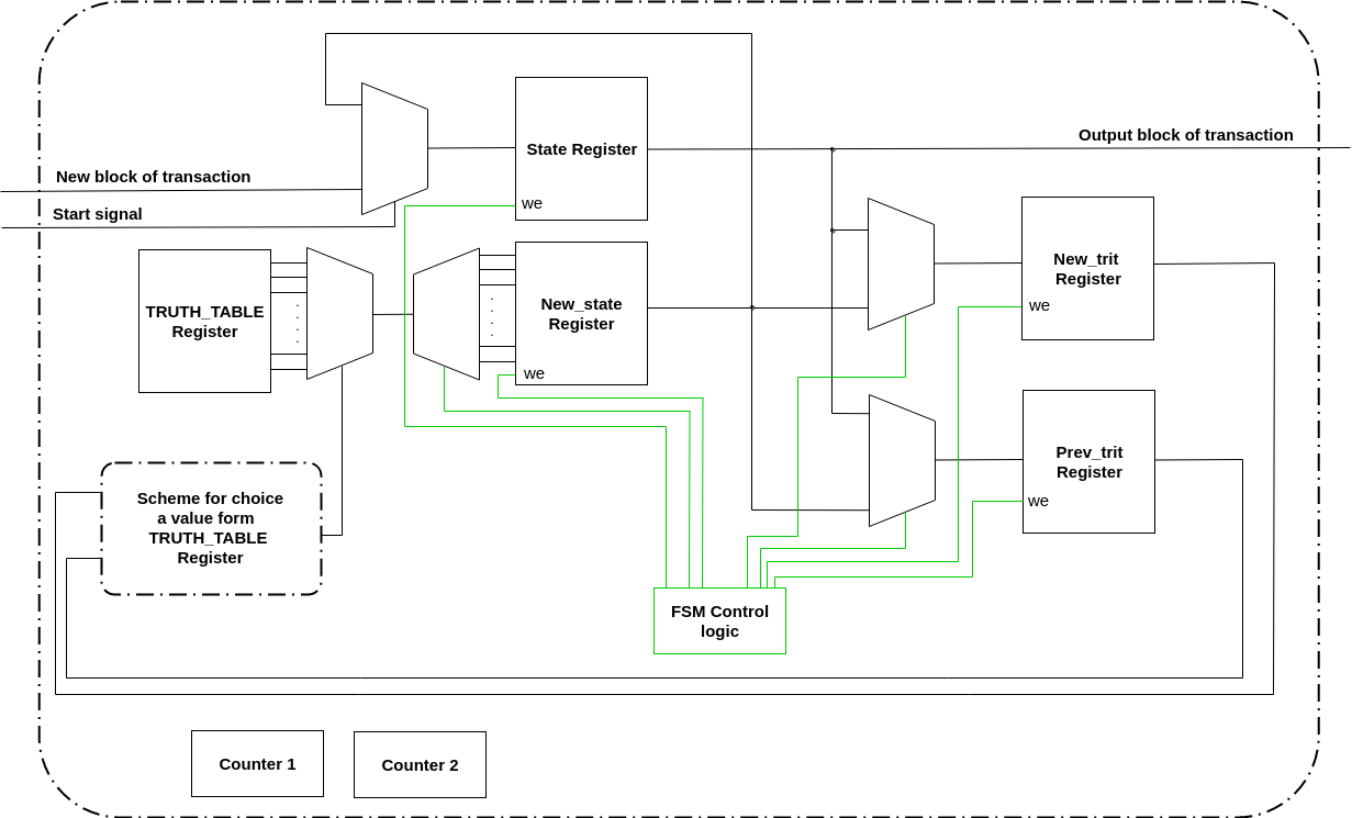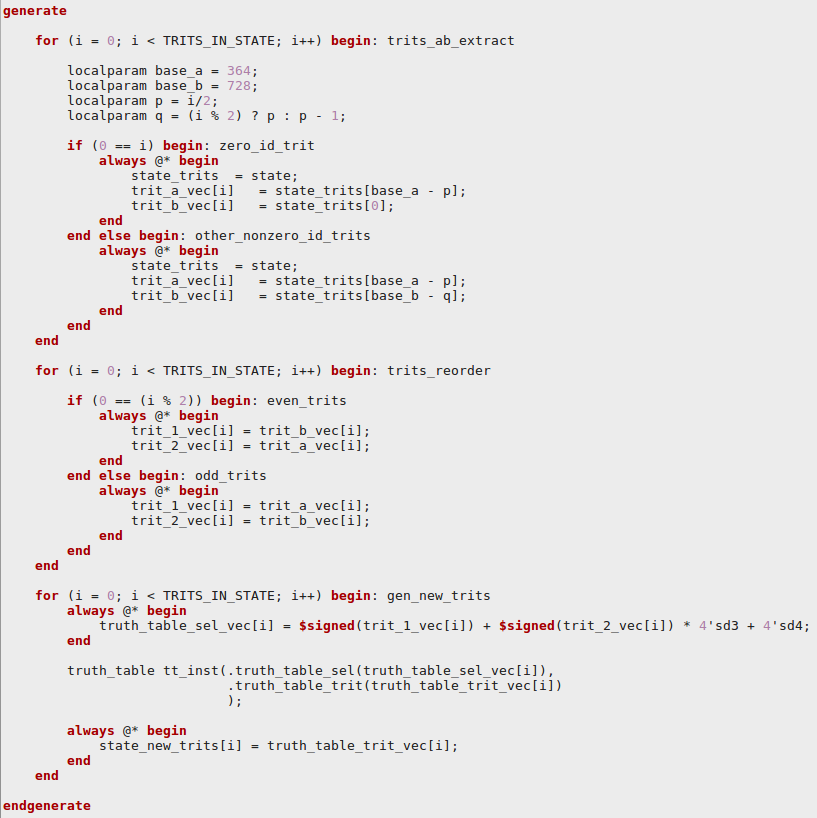 The tricky part here is finding new values for the nonce. We realized that combinational ternary incrementer takes a lot of hardware resources and has long delay. So we decided randomly generate new trits for the nonce via LFSR. But it is important to check each new trit obtained from LFSR for forbidden value 2'b10 and in such a case return some valid value (e.g. 2'b00 or 2'b11).