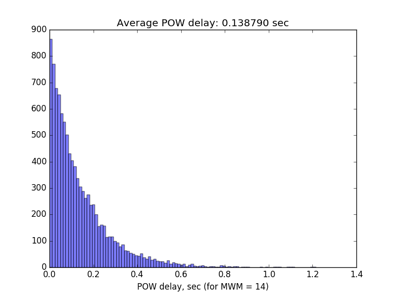 Here the histogram for POW delays in case of MWM = 14. As you can observe, almost all delays are within 0.6 sec with average of 0.14 sec. Measurement time for all 10 000 transactions was 24 minutes.