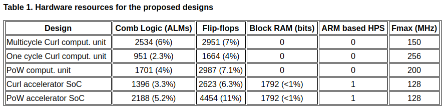 We optimized Curl & POW computational units for maximum clock frequency: 256 MHz for Curl comput. unit and 200 MHz for POW comput. unit. Unfortunately we had no time for optimisation of the SoCs for these calculation units. So the maximum clock rate for Curl & POW SoCs is 128 MHs. We think that clock rate for these SoCs can be significantly improved. It will be the task for future work.