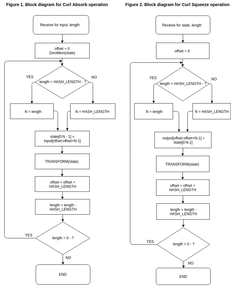 The block diagrams for Absorb, Squeeze and Transform algorithms utilized in Curl represented on Figures 1-3 respectively.